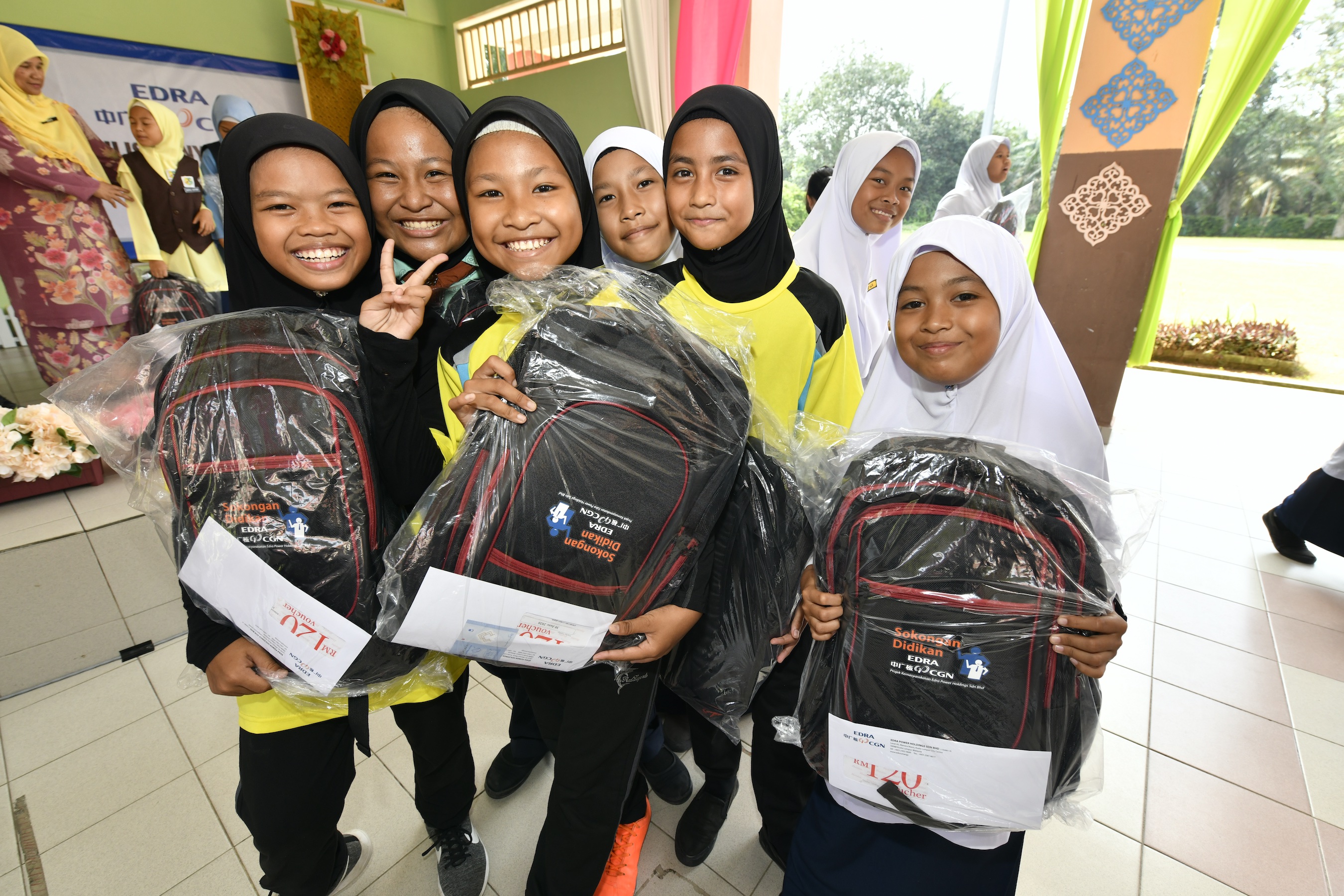 2019年11月,埃德拉公司對馬來西亞各電廠周邊莘莘學子開展教育援助計劃,圖為領取捐贈物資的小學生合影
