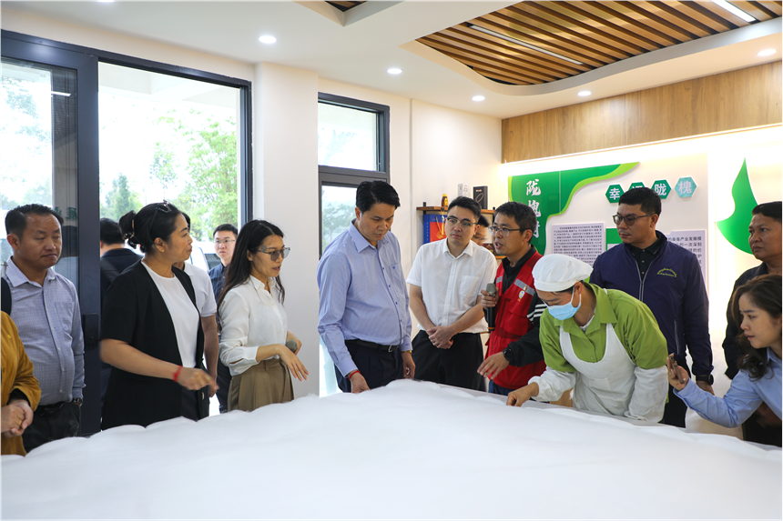 ▲考察團(tuán)在凌云縣桑蠶產(chǎn)業(yè)幫扶項(xiàng)目現(xiàn)場參觀蠶絲被